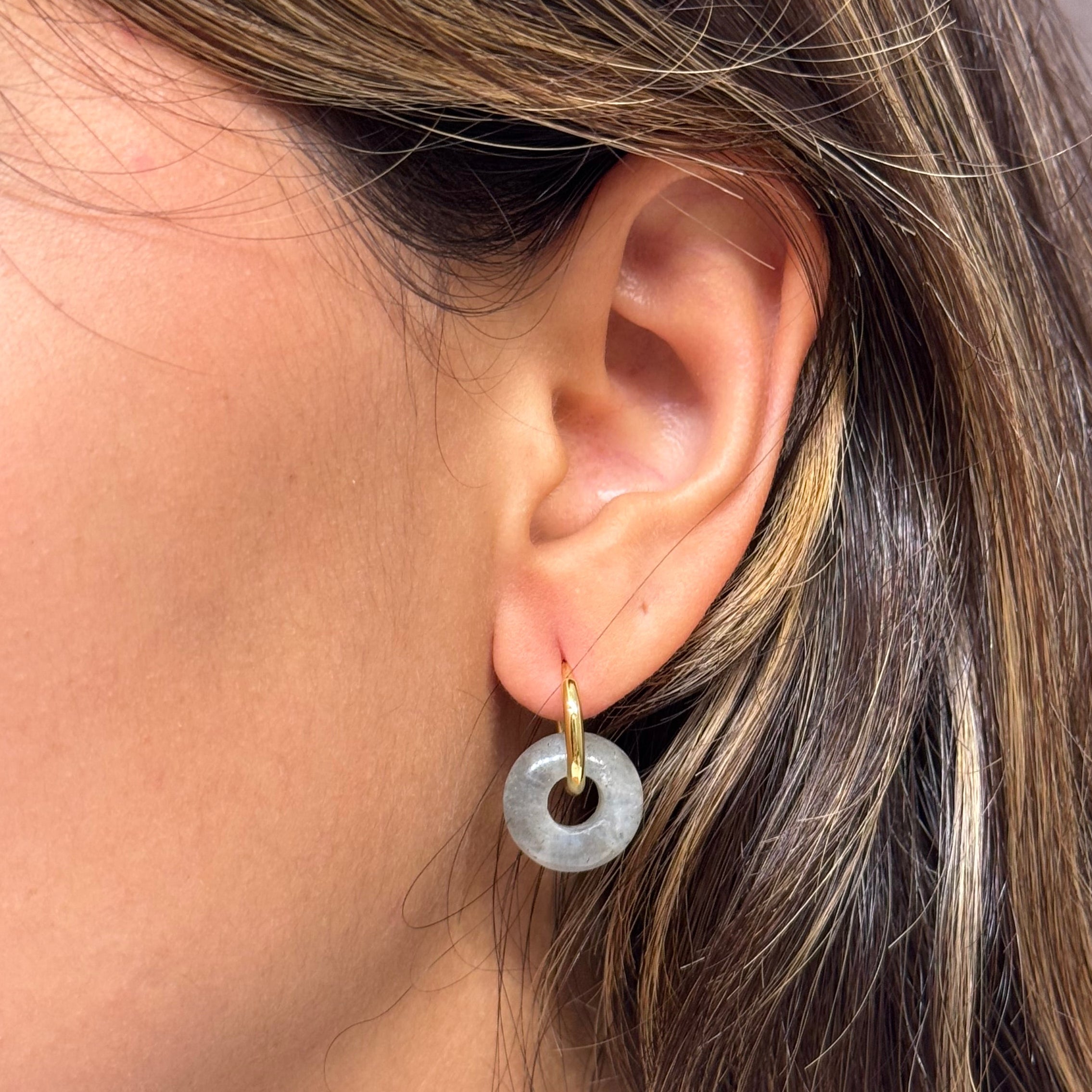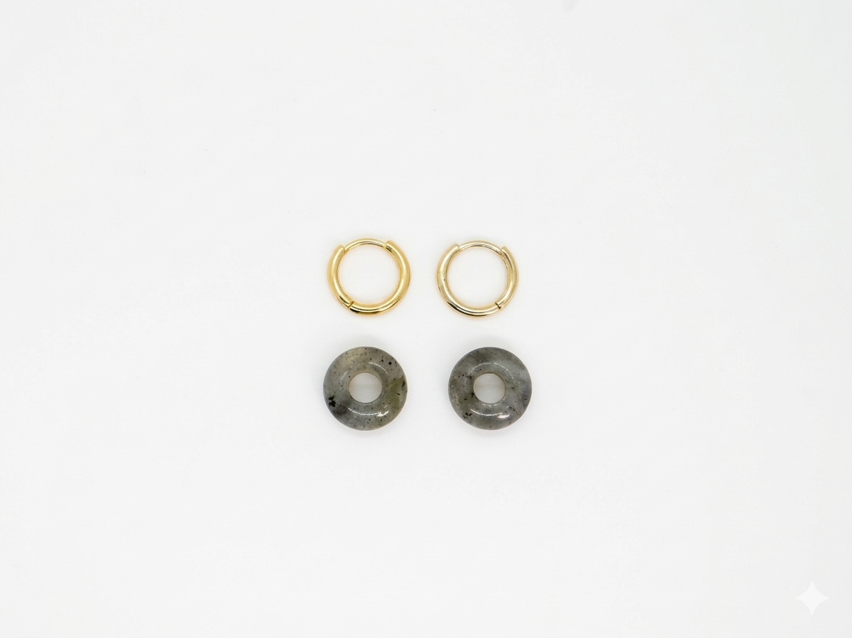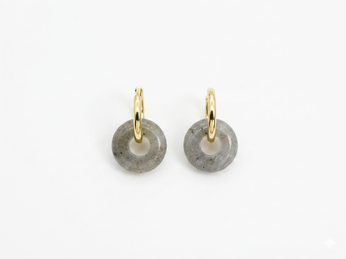 Delicados aros de oro laminado goldfilled de 14mm de base lisa con de Piedra natural labradorita color gris oscuro desmontable